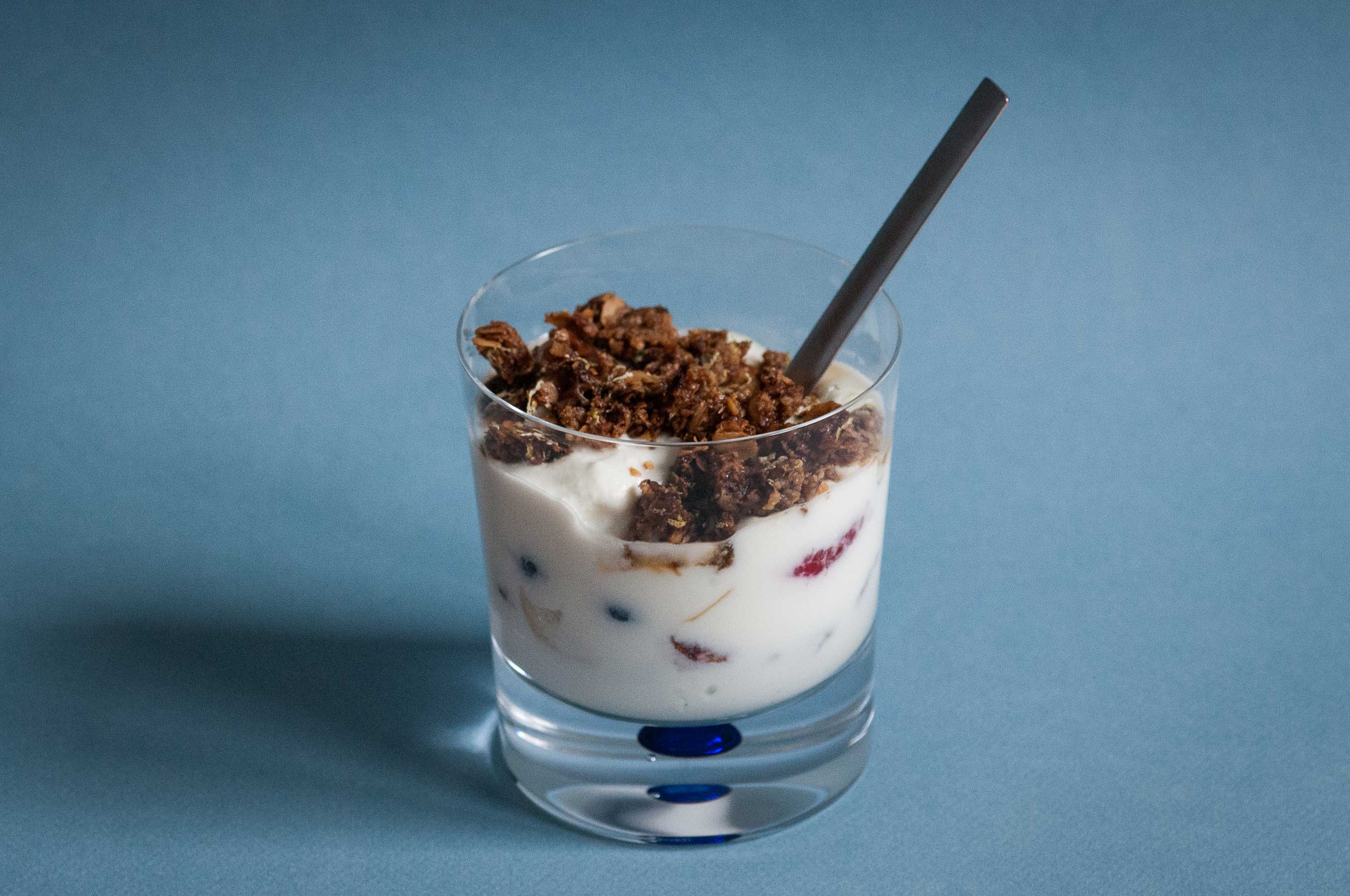 6. Place the fruit and berries in a glass, layer with yogurt, nuts and then yogurt again. On top, sprinkle the crumble. Or, using a large plate, layer the same way and top with the crumble.